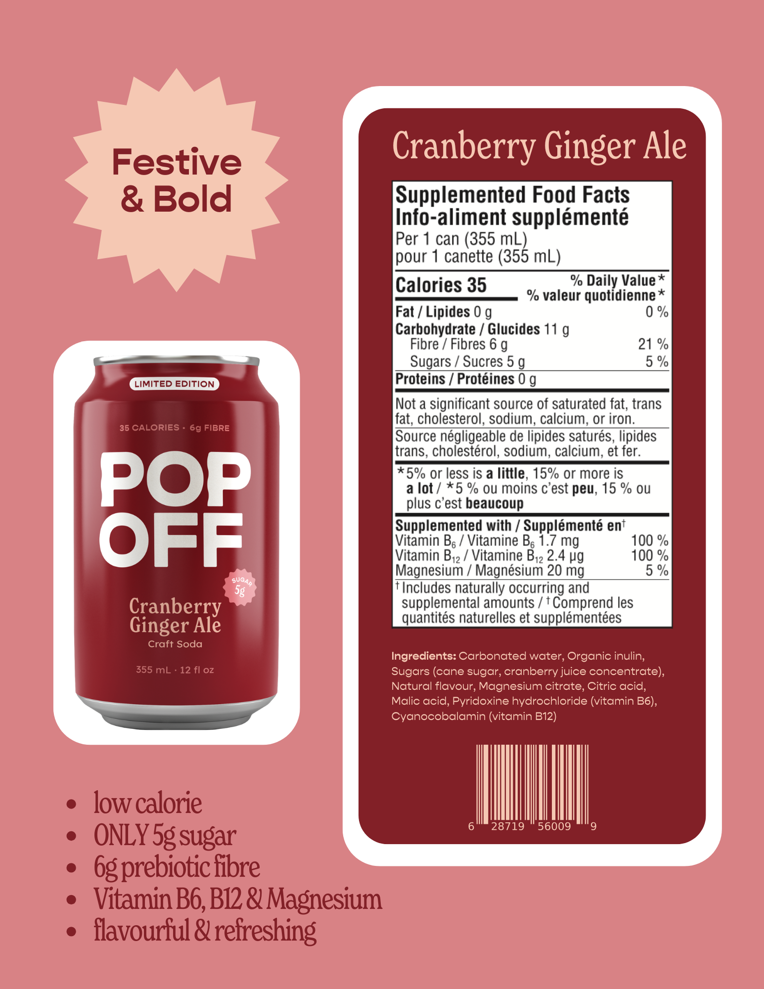 Ingredients: Carbonated water, Organic inulin, Sugars (cane sugar, cranberry juice concentrate), Natural flavour, Magnesium citrate, Citric acid, Malic acid, Pyridoxine hydrochloride (vitamin B6), Cyanocobalamin (vitamin B12)